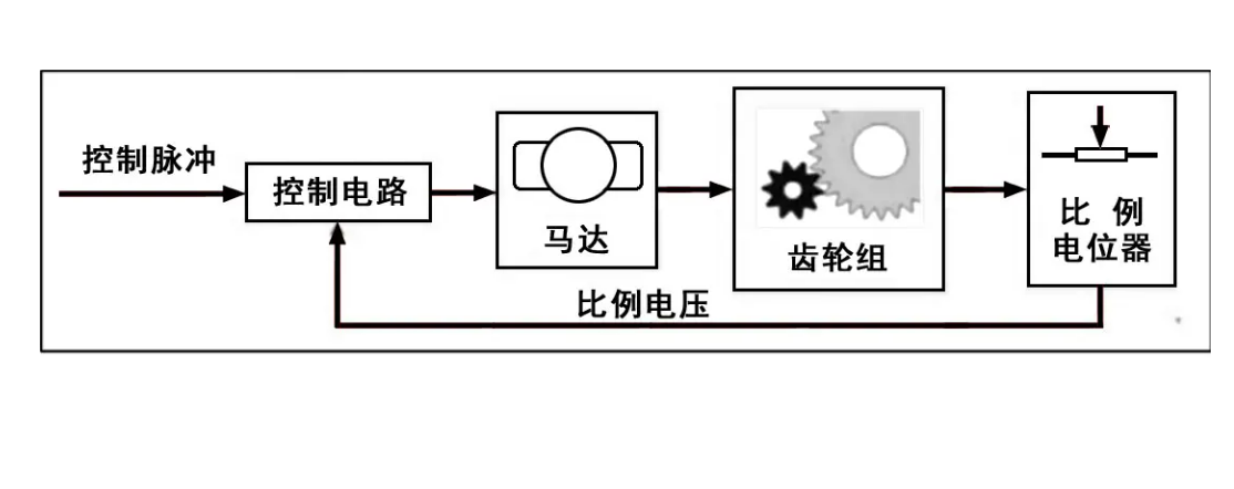 舵机工作原理是发出的脉冲讯号传给舵机,经由控制电路板驱动电机开始转动,通过减速齿轮组将动力传至摆臂部分,同时由电位器发送角度信号,判断摆臂是否达到预设角度。如果没有达到特定角度,电位器会通过电压变化回传至控制电路,通过传回的偏差控制电路会调整电机输出,使其与目标角度匹配,从而形成一个闭环控制