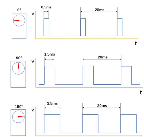 舵机的信号线中传输的是PWM信号,这种信号的周期一般为20ms