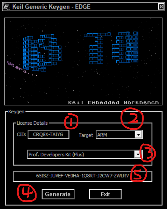 然后将刚刚复制的CID粘贴到1位置,在2位置的下拉菜单里选择ARM,然后在3位置的下拉选单里选择Prof.Developers Kit (Plus),然后点击4位置的Generate,然后复制5位置的一串密码