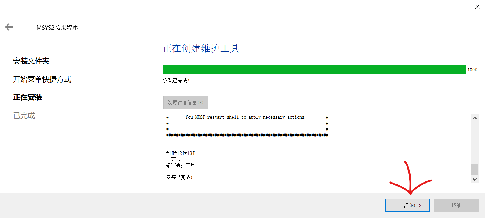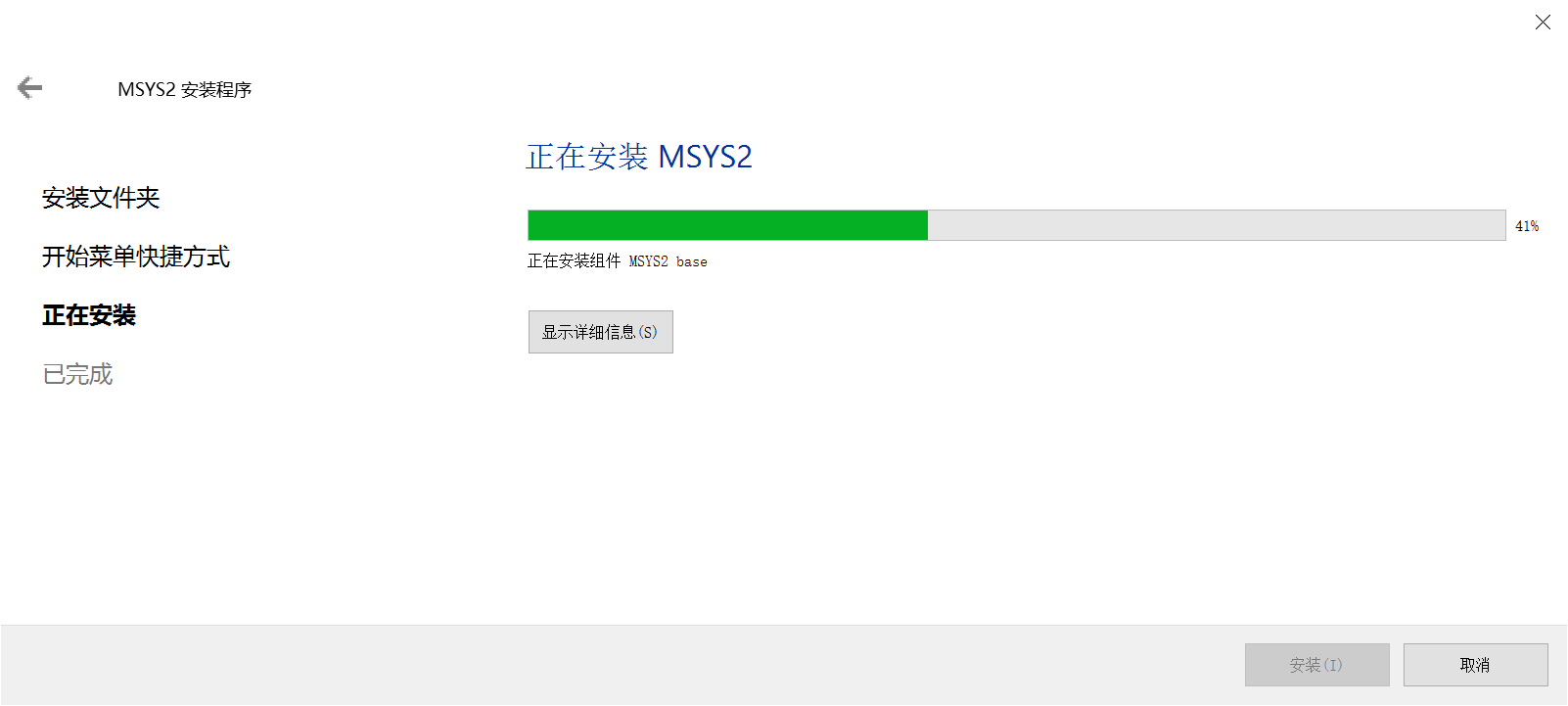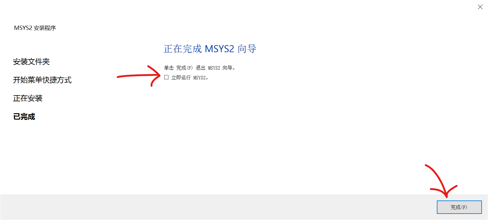 取消勾选立即运行 MSYS2,点击完成,退出安装程序