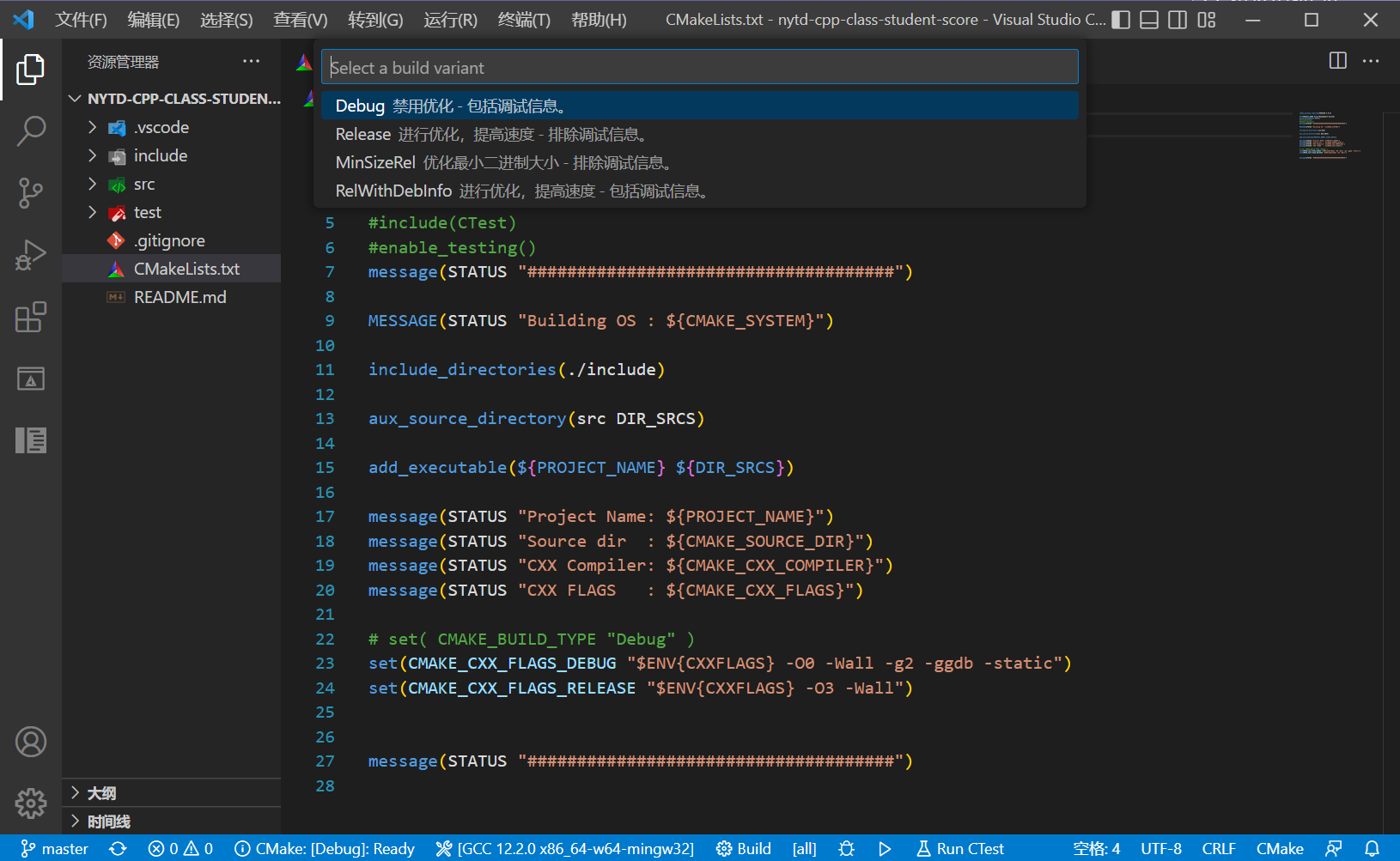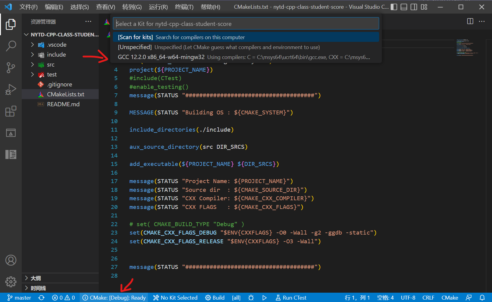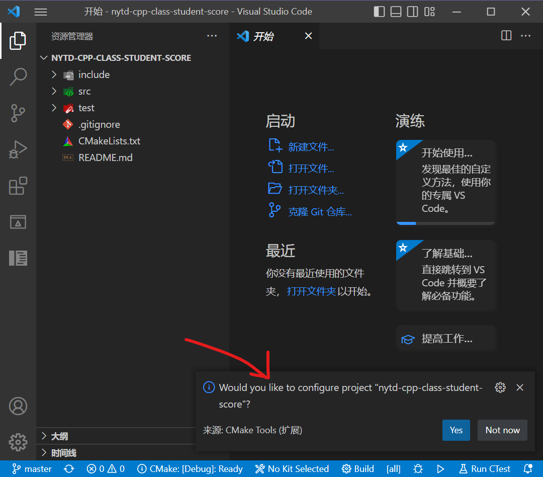 右下角的提示是来自CMake Tools扩展的提示,询问你是否配置当前工程,根据你自己的情况来选择。