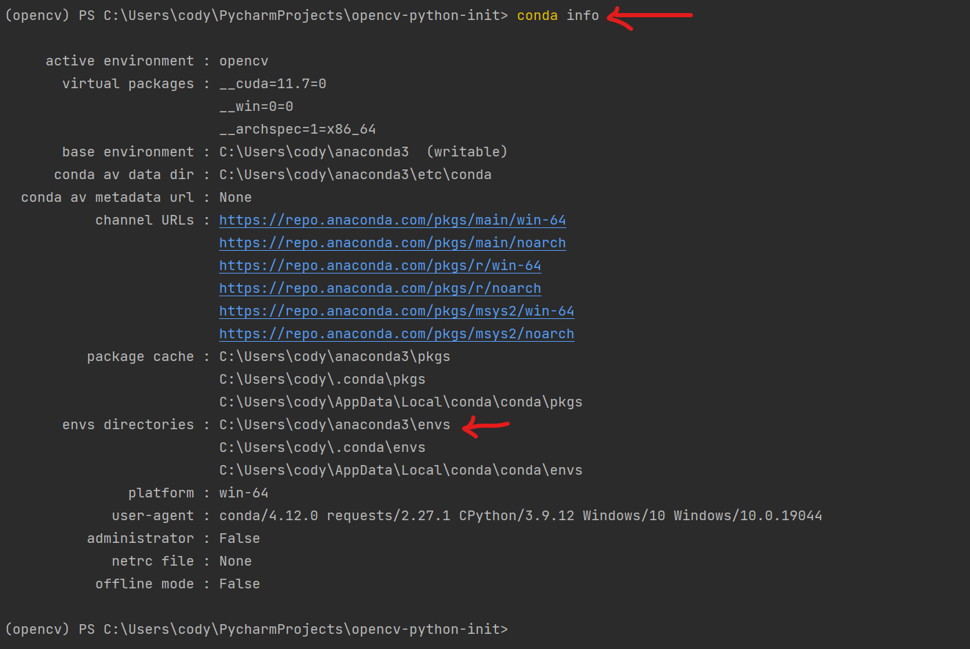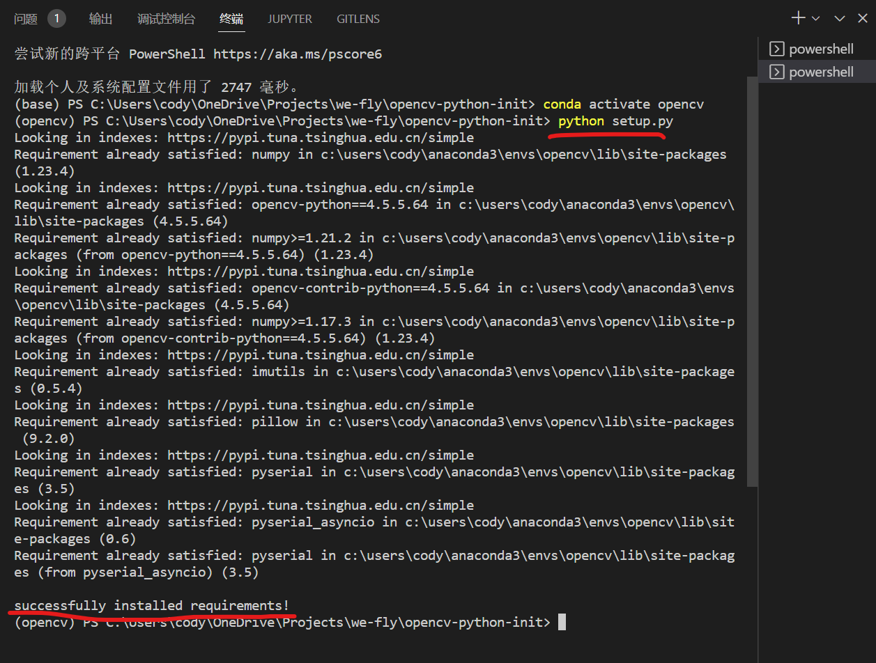 这个时候你的终端最左侧应该会从(base)变成(opencv)或者<conda环境名称>